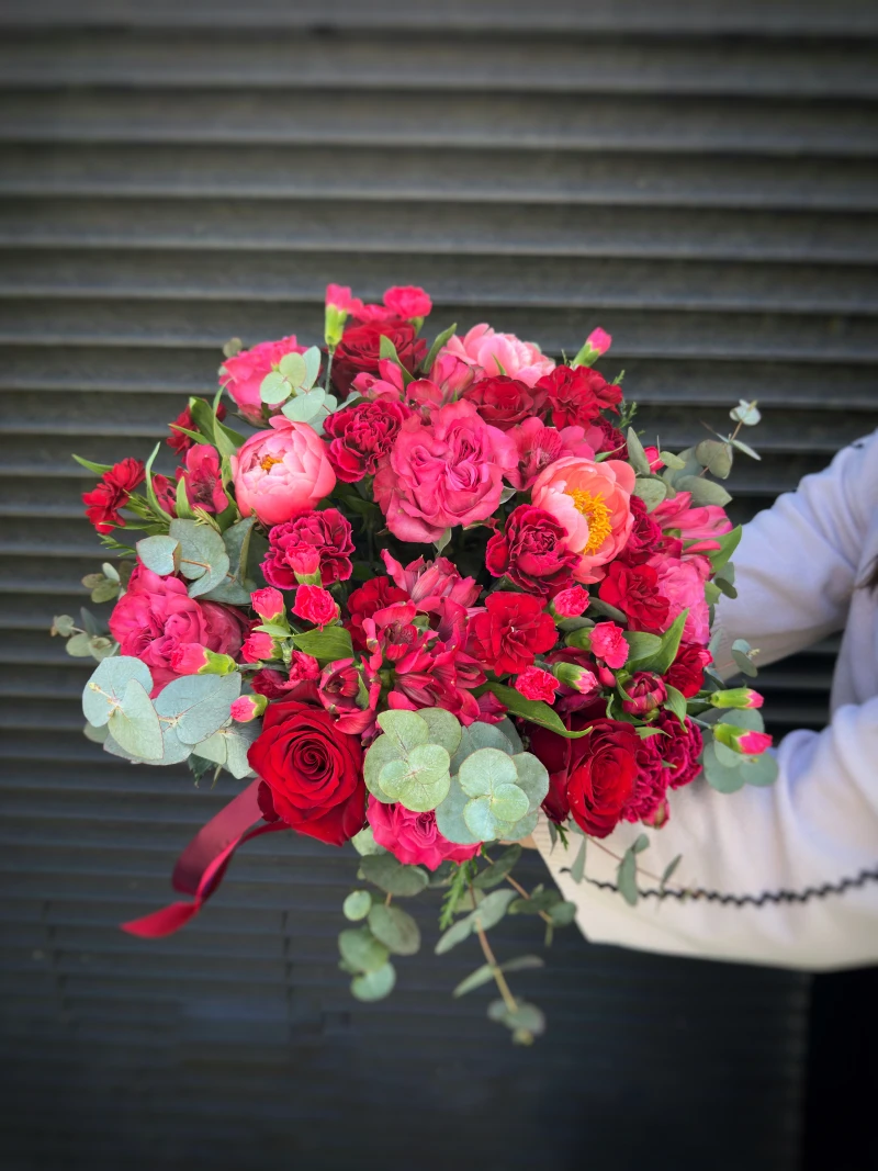 Elegancki bukiet w intensywnych odcieniach różu i czerwieni, który przyciąga uwagę i wyraża najpiękniejsze emocje. Idealny na wyjątkowe okazje lub jako spontaniczny gest pełen uczuć.